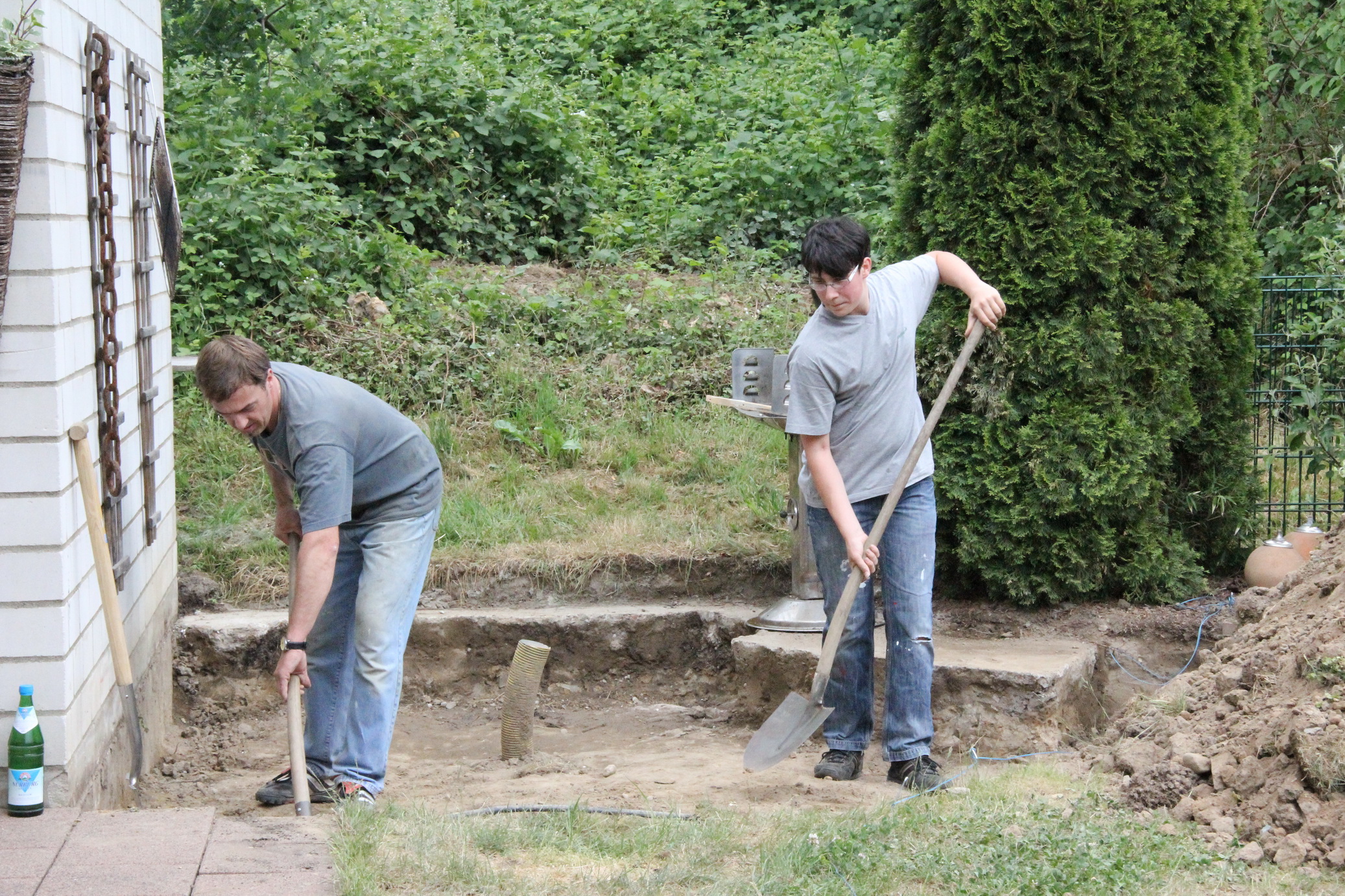 Auf jeden Fall wurde heute die alte Terrasse angegangen und erste Steinreihen entfernt.